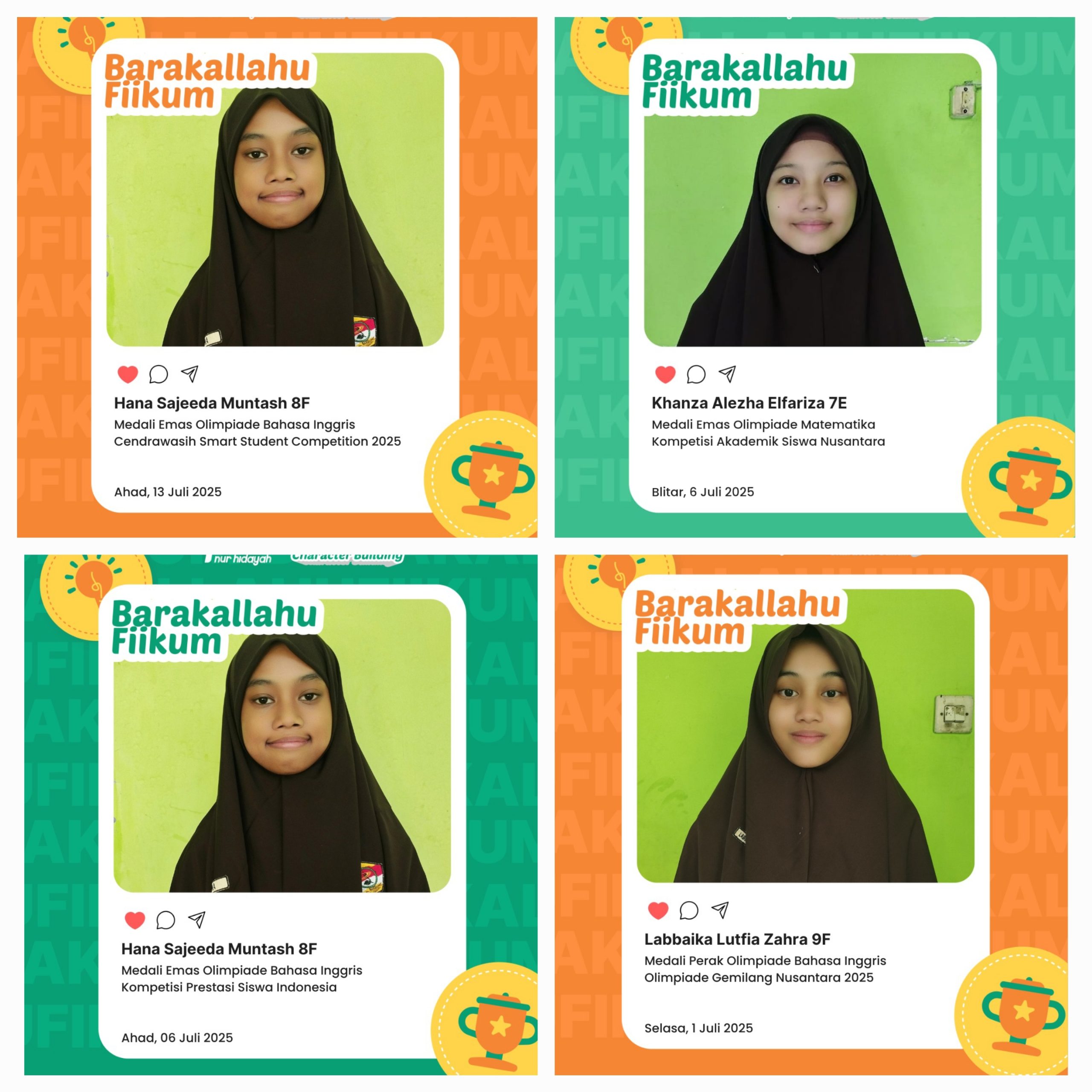 Surakarta, 16 Juli 2025 – SMPIT Nur Hidayah Surakarta kembali menunjukkan prestasinya di tingkat nasional. Beberapa siswi berprestasi telah berhasil meraih medali emas dan perak dalam berbagai kompetisi akademik.