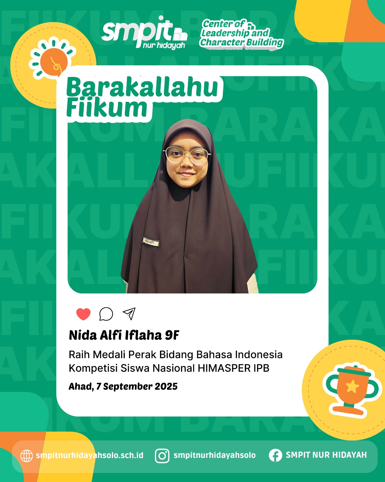 Nida Alfi Iflaha, siswi kelas 9F SMPIT Nur Hidayah Surakarta, kembali mengukir prestasi gemilang dengan meraih Medali Perak Bidang Bahasa Indonesia dalam ajang Kompetisi Siswa Nasional HIMASPER IPB. Kompetisi yang diadakan pada Ahad, 7 September 2025, ini menunjukkan kemampuan Nida dalam menguasai bahasa Indonesia dengan sangat baik. Dengan prestasi ini, Nida membuktikan dirinya sebagai salah satu siswa berprestasi di SMPIT Nur Hidayah Surakarta.