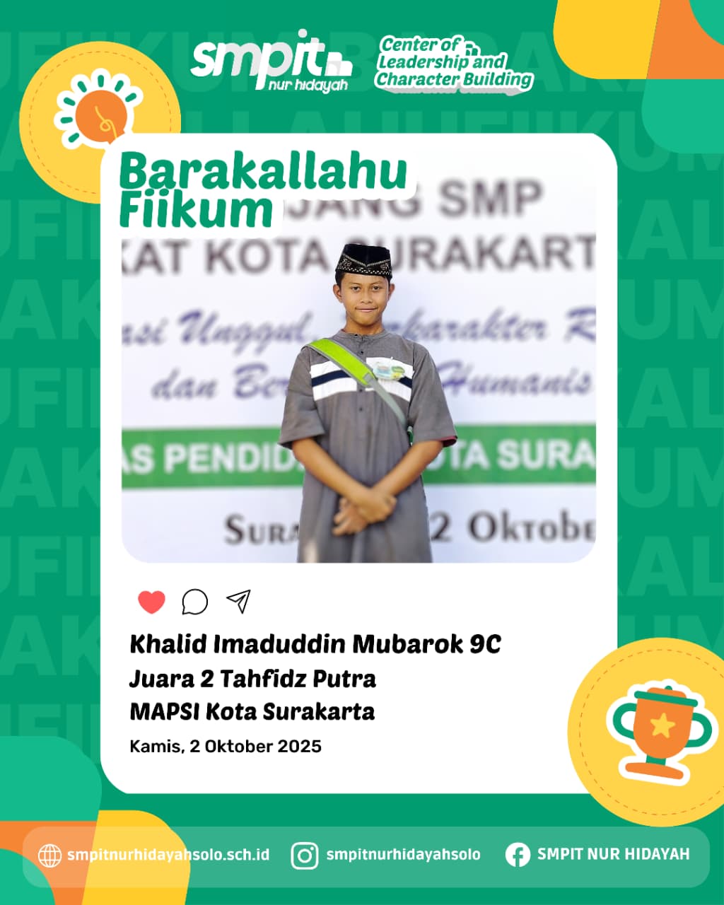 SMPIT Nur Hidayah Surakarta kembali menunjukkan keunggulannya dengan meraih prestasi membanggakan dalam Lomba Mata Pelajaran dan Seni Islam (MAPSI) Kota Surakarta yang berlangsung pada Kamis, 2 Oktober 2025. Ajang ini menjadi wadah bagi siswa-siswi untuk menunjukkan kemampuan mereka dalam berbagai bidang keislaman dan seni.
