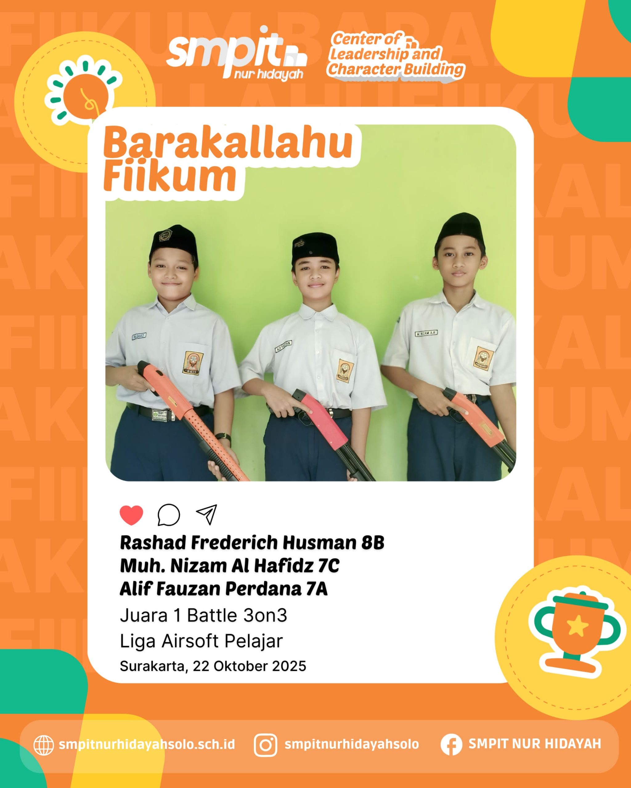 SMPIT Nur Hidayah Surakarta kembali menunjukkan keunggulannya dalam bidang olahraga dan strategi dengan meraih Juara 1 Battle 3on3 dalam Liga Airsoft Pelajar Piala Kevin Rizky 2025. Kompetisi yang diselenggarakan di Surakarta pada 22 Oktober 2025 ini diikuti oleh siswa-siswa berbakat dari berbagai sekolah di wilayah Surakarta dan sekitarnya.