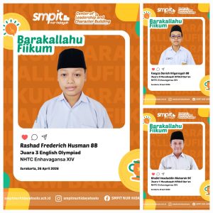 Kepala Sekolah SMPIT Nur Hidayah Surakarta menyampaikan rasa syukur dan bangga atas capaian para siswa. “Prestasi ini adalah buah dari kerja keras anak-anak, bimbingan para ustaz/ustazah, serta doa dari orang tua. Semoga menjadi wasilah untuk terus berprestasi dan berakhlak Qur’ani,” ujarnya.